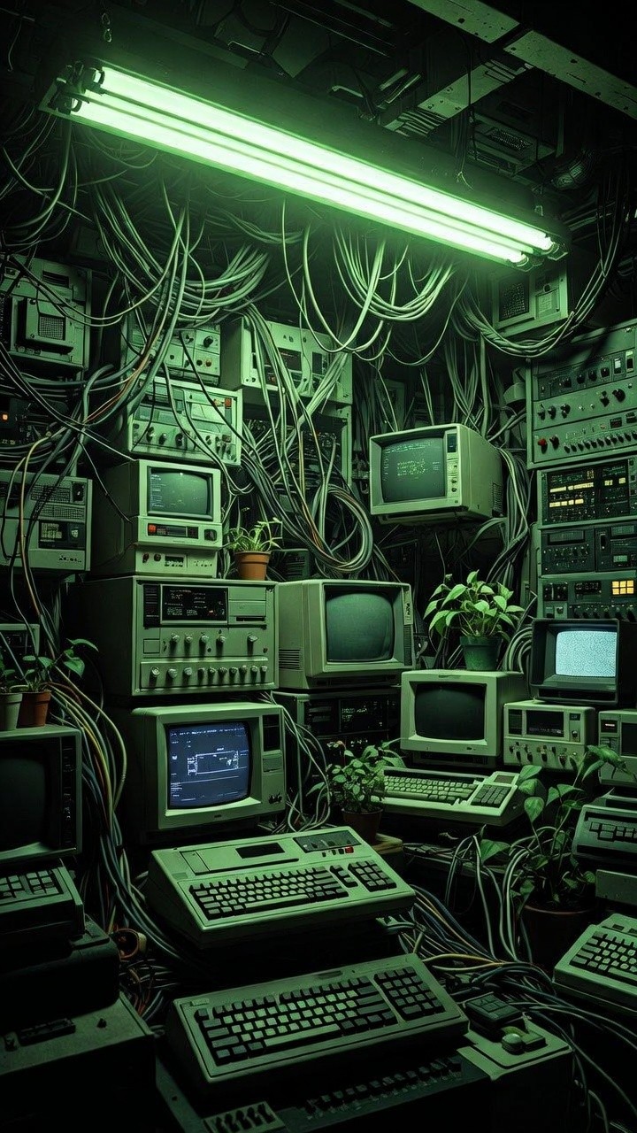 A dense vertical composition showcasing a complex array of vintage computer hardware, CRT monitors, and tangled cables. A large, horizontal green fluorescent light at the top casts a monochromatic neon glow over the entire scene, highlighting the dusty textures of the retro keyboards and analog controls. Small potted plants are interspersed throughout the technical clutter, their organic leaves creating a stark contrast with the mechanical environment. The overall aesthetic is gritty and atmospheric, perfectly capturing a low-life, high-tech cyberpunk workstation.