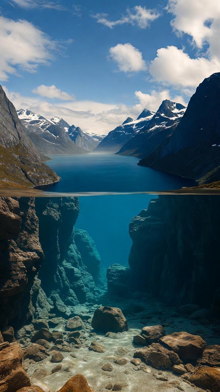 A stunning vertical split-view photograph showcasing the duality of a mountain fjord. The upper half features a calm, deep blue body of water nestled between jagged, snow-capped peaks under a bright sky with scattered white clouds. The lower half reveals the world beneath the surface: a crystal-clear underwater canyon with dramatic vertical rock walls and a seabed covered in smooth, light-colored stones. The natural lighting transitions from the soft glow of the sun above to a deep, ethereal blue in the depths, highlighting the vastness and clarity of the alpine environment.