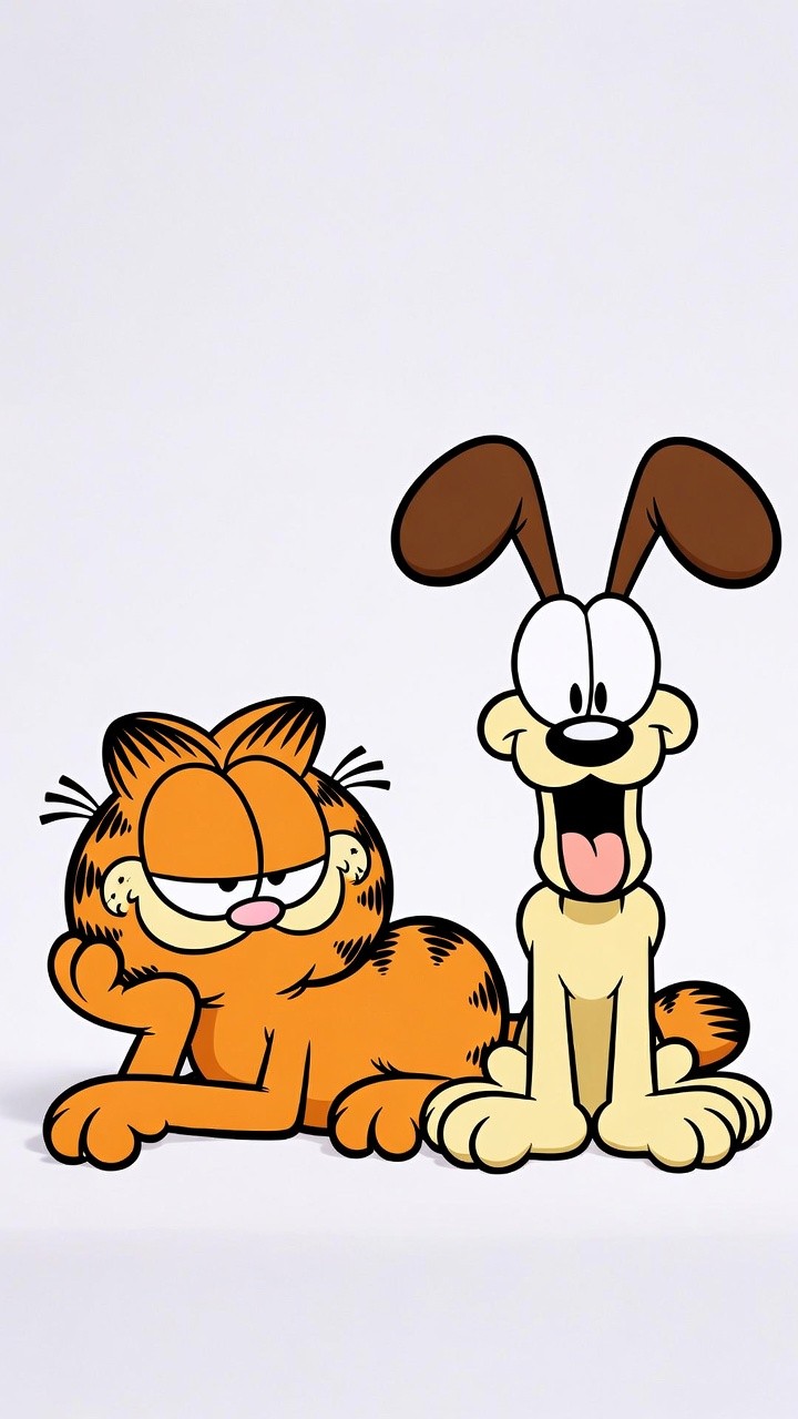 You can practically feel the personality clashing in this shot! Garfield is doing exactly what he does best—lounging around with that classic, half-lidded "don't bother me" expression that we've all felt at least once. Right next to him, Odie is just a bundle of pure, unbothered joy with his tongue out and eyes wide. The clean white background really lets their bright colors pop, making it a perfect, nostalgic piece for anyone who loves the legendary dynamic between a grumpy cat and his overly-excited best friend.