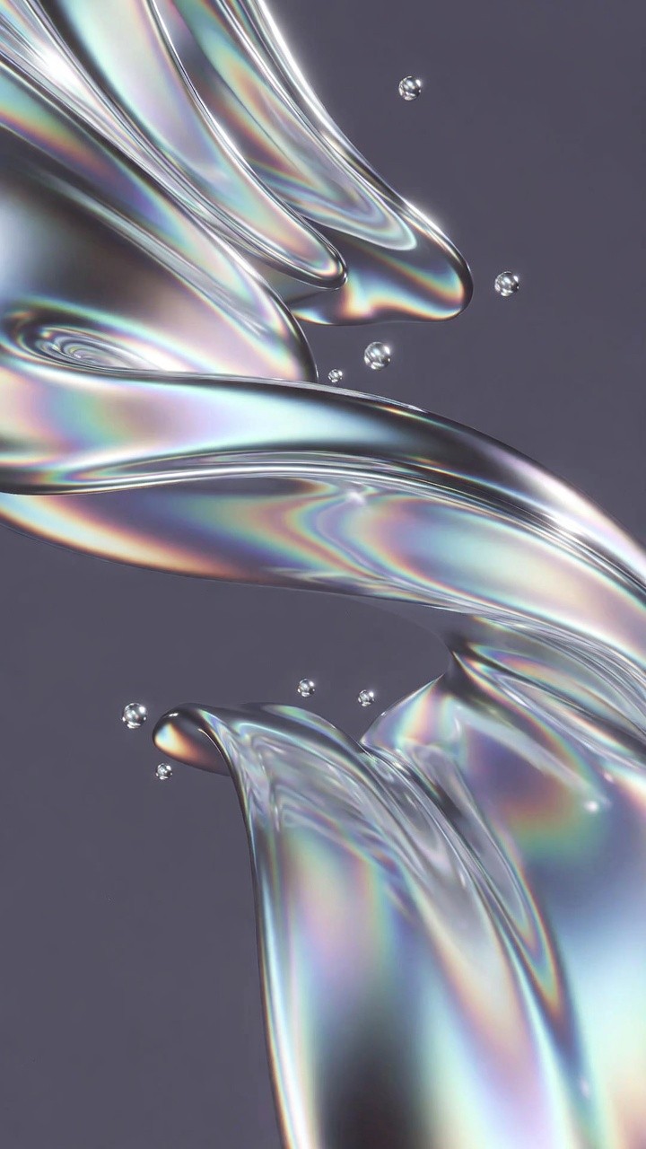 A stunning 3D abstract composition features thick, flowing ribbons of iridescent liquid that resemble molten glass or mercury. The surface of the waves reflects a full spectrum of rainbow colors against a neutral grey background. Small, spherical droplets of the same pearlescent material float weightlessly around the main flow. The lighting is soft and professional, highlighting the smooth, reflective textures and the fluid, organic motion of the shapes.