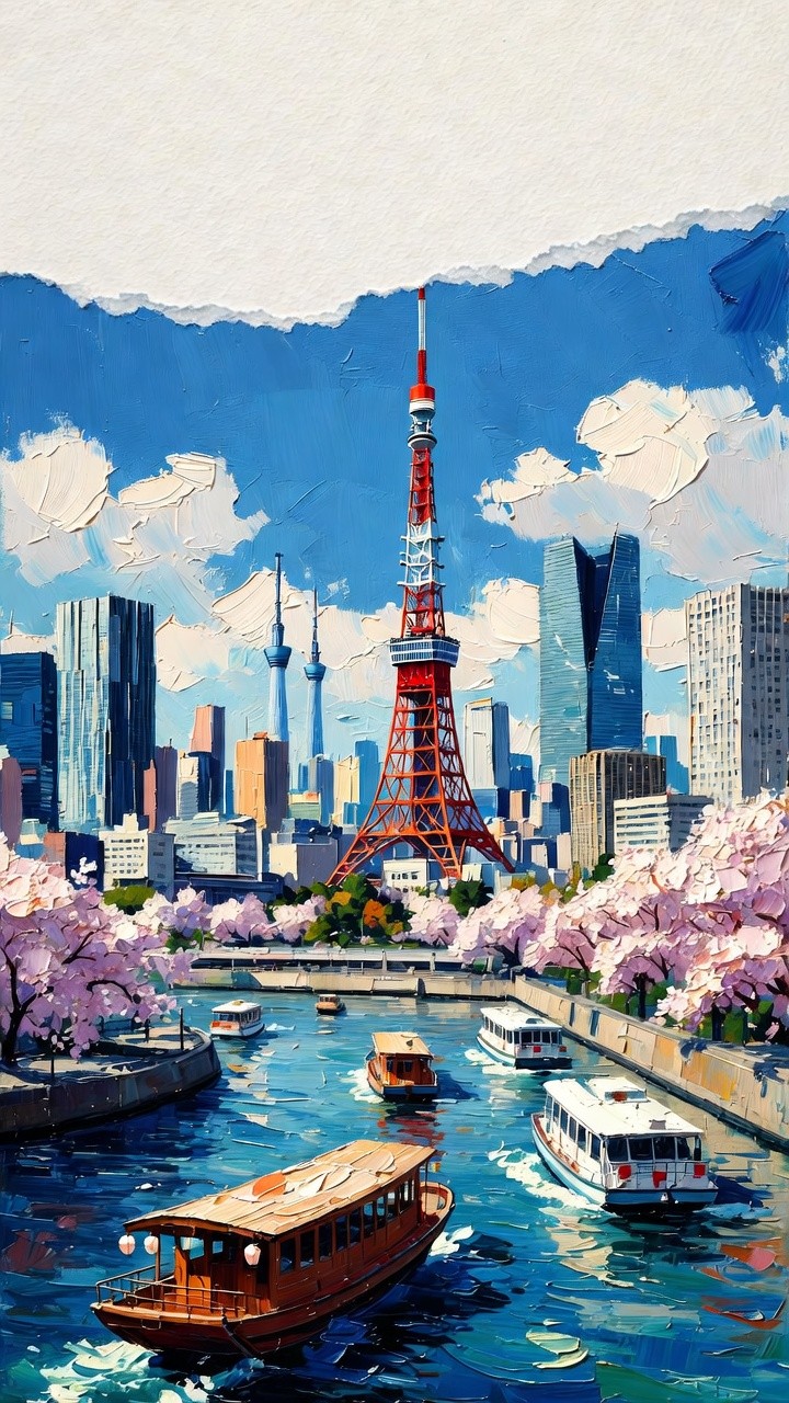 Immerse yourself in the vibrant beauty of Japan's most famous season. This exquisite digital oil painting features the iconic red Tokyo Tower standing tall amidst a sea of blooming pink cherry blossoms (Sakura). Below, traditional wooden yakakatabune boats glide alongside modern cruisers on the shimmering blue river, creating a perfect harmony between old and new. The rich, textured brushstrokes and the unique torn-paper frame turn this classic travel scene into a masterpiece of color and light.