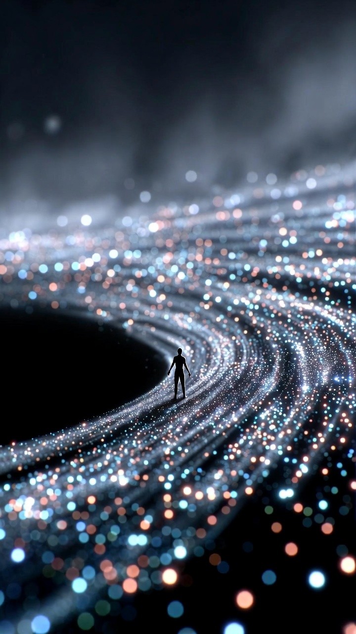Embark on an infinite journey with this mesmerizing live wallpaper. A lone silhouette stands upon a sweeping, majestic river of glowing stardust. The striking bokeh effect blends cool icy blues with warm, shimmering peach tones, creating a breathtaking contrast against the dark, mysterious void. It is a deeply cinematic, dreamlike aesthetic that will add a touch of abstract magic and wonder to your lock screen.