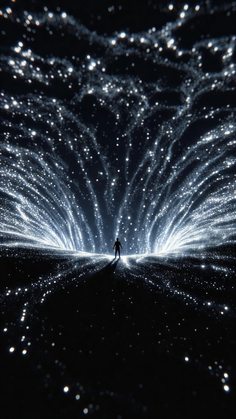 Step into the unknown with this mesmerizing and cinematic live wallpaper. A lone silhouette stands at the edge of a breathtaking cosmic portal, surrounded by sweeping waves of glowing, starlit particles. The striking contrast between the pitch-black void and the brilliant, swirling lights creates a deep sense of mystery and infinite space. This dynamic, out-of-this-world animation is perfect for adding a touch of awe-inspiring sci-fi magic to your lock screen.